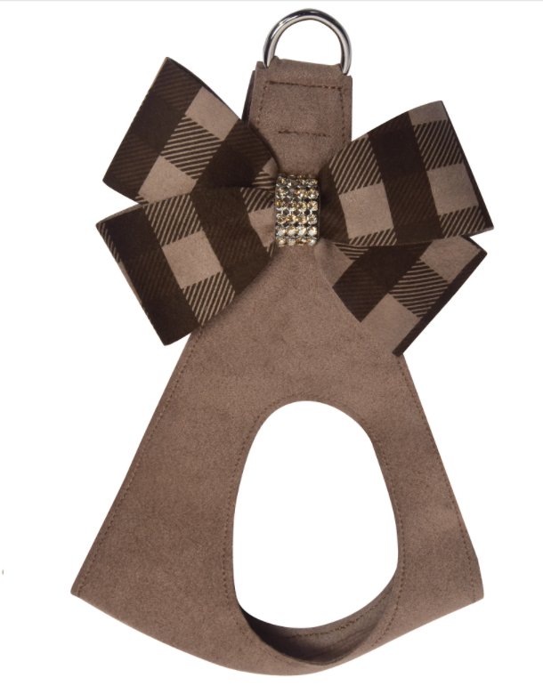 Smile! It’s Gingham style. This harness is for those who value no-fuss convenience and no-choke comfort for their dog. Made from Ultrasuede® fabric with the soft texture and feel of premium suede. Ultrasuede® also has the highest grade of durability, making this harness resistant to stains and discoloration, it is even machine washable! The Tiffi Gingham Nouveau bow captures all attention with bold curves embraced by rows of gleaming Swarovski Crystals®. The cut is well below the dogs’ neck so any pulling is across the shoulders and not the neck resulting in pure comfort for your dog. The harness fastens by a single quick-release buckle. Manufactured in the USA