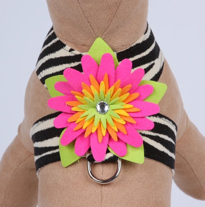 Our Island Flower collection gives you the best of style and plenty of color with Swarovski Crystal.Here is a great harness for those who want a basic, functional harness. Comfortable for the dog, easy for you to maintain and constructed from an indestructible material, this harness is a good value that will last a long time. In addition to that, the fabric gives you a wide range of colors from soft pastels to vibrant hues. Like all of our designs, it is made from genuine commercial upholstery grade Ultrasuede® fabric that we import from Japan. This soft, comfortable fabric is breathable, washable and colorfast. As an assurance to both you and your customer, each item comes with an Ultrasuede® tag with instructions on the back for cleaning and maintenance.
