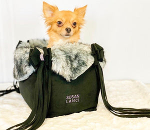 The Susan Lanci Ultra-Suede Carrier is a great bag for you and a safe, comfortable place for your best friend. The exterior is made of soft luxe suede and the interior is lined with the same plush Minky Curley Sue fabric that we use for our blankets. Swarovski Heart crystal adorns the bag for a sparkle! This bag features: Features two 3" wide shoulder straps Tether strap to clip onto your dog's collar or harness Matching super soft and plush 12" x 16" faux fur blanket Carrier accommodates pets up to about 8 lbs Susan Lanci is always made in the USA