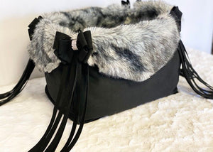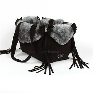Susan Lanci Luxury Purse Carrier Collection- Nouveau Bow with Fringe Black with Grey Black Tipped Faux Fur