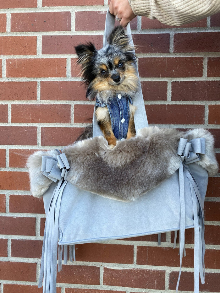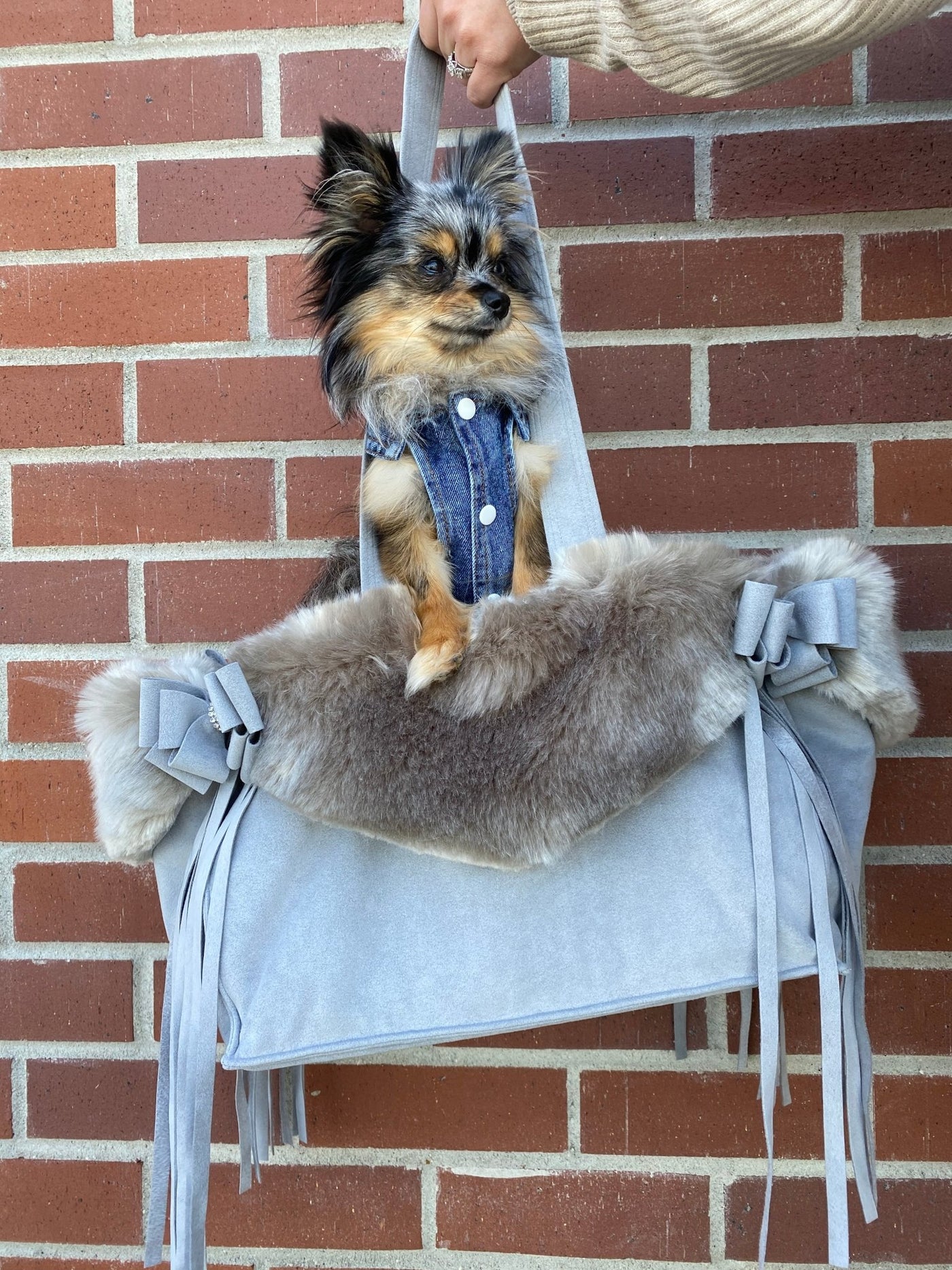 The Susan Lanci Ultra-Suede Carrier is a great bag for you and a safe, comfortable place for your best friend. The exterior is made of soft luxe suede and the interior is lined with the same plush Minky Curley Sue fabric that we use for our blankets. Swarovski Heart crystal adorns the bag for a sparkle! This bag features: Features two 3" wide shoulder straps Tether strap to clip onto your dog's collar or harness Matching super soft and plush 12" x 16" faux fur blanket Carrier accommodates pets up to about 8 lbs Susan Lanci is always made in the USA