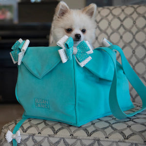 Susan Lanci Carrier The Susan Lanci Ultra-Suede Carrier is a great bag for you and a safe, comfortable place for your best friend. The exterior is made of soft luxe suede.Features two 3" wide shoulder straps Tether strap to clip onto your dog's collar or harness Matching super soft and plush 12" x 16" faux fur blanket Carrier accommodates pets up to about 8 lbs Susan Lanci is always made in the USA ***This item is a custom made to order item. It is not eligible for returns or exchanges. Please contact us with sizing questions prior to purchasing.*** *Custom order please allow 4-6 weeks for production***