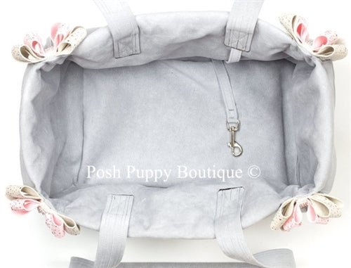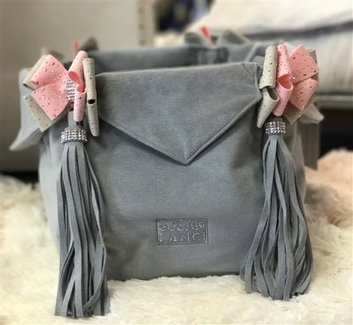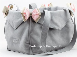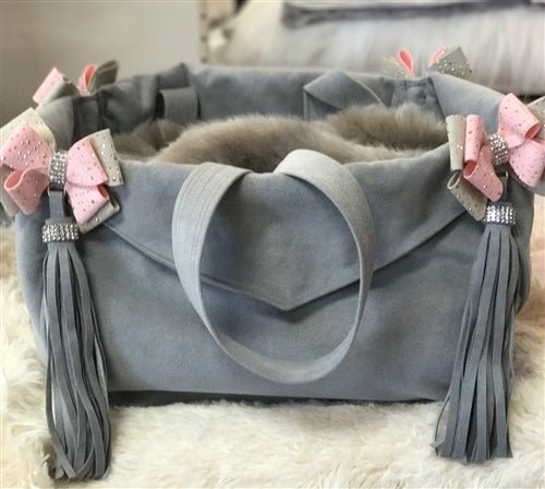 Susan Lanci Luxury Purse Carrier Collection- Ultrasuede in Platinum and Puppy Pink Nouveau Bow