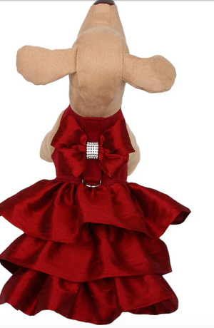 Susan Lanci Madison Dress The perfect item for a special celebration, a classy daytime event, or even a formal night out. The Madison dress functions like a harness, making it not only cute and fancy, but practical as well. The body is made of genuine upholstery grade Ultrasuede fabric imported from Japan. The rest of the dress is made with a durable luxurious Dupioni material that is completely machine washable. The hook and loop closure at the neck and underbelly allow for easy on and off action. Attach your favorite leash, add a matching hair bow, and you are ready for any event.