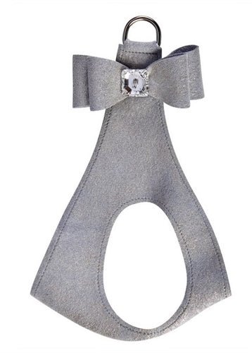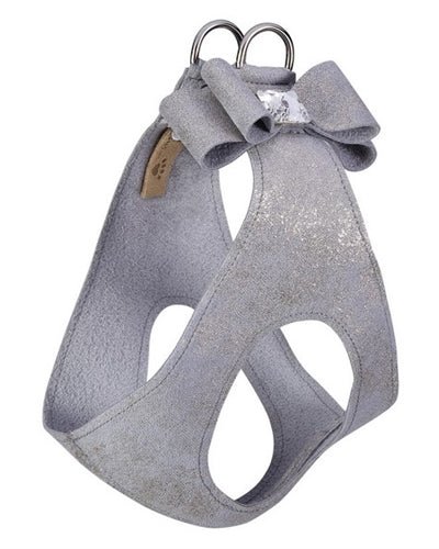 Our new favorite... The Glitzerati Collection! A hint of shimmer adds another level of beauty to the already gorgeous Ultrasuede. This foil like effect is embedded into the Ultrasuede so that none of this glitz will rub off or wash out. Just like our solid Ultrasuede's, use after use, wash after wash, this timeless fabric will maintain it's beauty. Also known as the Pure & Simple, this harness fastens by a single quick-release buckle located above the dogs’ shoulders and is cut well below the dogs’ neck so the pulling is across the shoulders and not the neck. The end result is pure comfort for the dog. Easy for you to maintain, this harness, including the Glitzerati Big Bow centered with a Swarovski Crystal button, is made from genuine commercial upholstery grade Ultrasuede® fabric that we import from Japan. This soft, comfortable fabric is breathable, washable and colorfast. As an assurance to both you and your customer, each item comes with an Ultrasuede® tag with instructions on the back for cleaning and maintenance. Manufactured in the USA