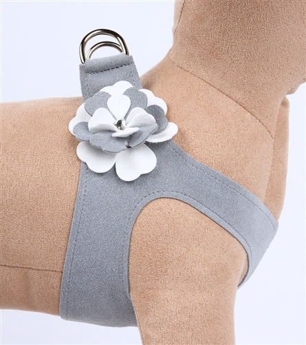 Here just the product for those who want convenience for them and no-choke comfort for their dog. The harness fastens by a single quick-release buckle located above the dogs’ shoulders. The harness is cut well below your dogs’ neck so the pulling is across the shoulders and not the neck. The end result is pure comfort for your dog. Easy for you to maintain, this harness is made from genuine commercial upholstery grade Ultrasuede® fabric that we import from Japan. This soft, comfortable fabric is breathable, washable and colorfast. As an assurance to both you and your customer, each item comes with an Ultrasuede® tag with instructions on the back for cleaning and maintenance. For those designs with crystal, it is exclusively Swarovski. Lastly, this harness is manufactured in the USA. Matching collar, leash & hair bow are available. Colors are limited to what is shown.