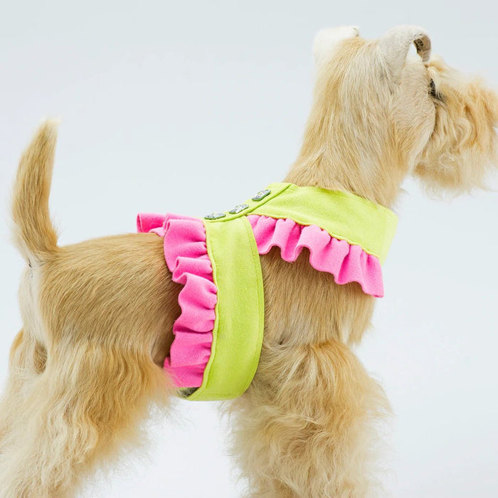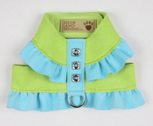 The Pinafore Tinkie Harness' elegant design offers a glamorous and dressy look while still being functional and comfortable. Made with an indestructible material, this harness is a good value that will last a long time. Hook and loop under belly closure allows for no fuss put on and take off action. In addition to that, the fabric gives you a wide range of colors – from soft pastels to vibrant hues. Like all of our designs, it is made from genuine commercial upholstery grade Ultrasuede® fabric that we import from Japan. This soft, comfortable fabric is breathable, washable and colorfast. As an assurance to both you and your customer, each item comes with an Ultrasuede® tag with instructions on the back for cleaning and maintenance.
