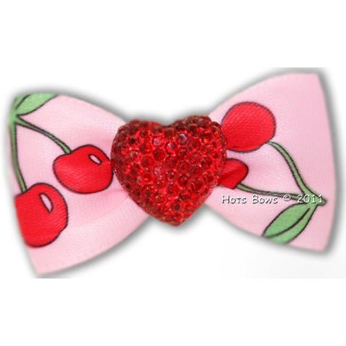 Red galaxy heart on a soft pink ribbon decorated with pairs of cherries. This bow is too cute!