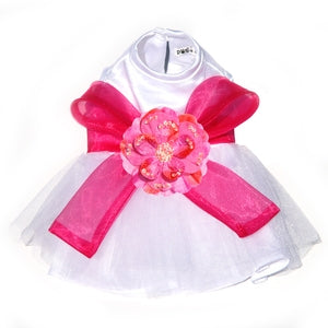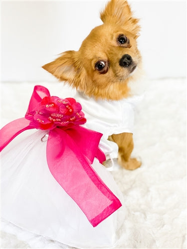 The Madeline with Hot Pink Sash Dress is perfect dress for special occasions. Ribbon Roses adorn the bodice with layers of soft, shimmery tulle covering the satin skirt. Dress has adjustable waist with D-Ring for leash attachment.