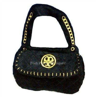 The handbag every woman wants is now the toy every dog needs. Black quilted plush exterior, gold accents, and fun Tory Bark logo give this toy lots of style! Tory Bark bag has a fun squeaker inside that drives dogs crazy. Every Pampered Pup should have one of these cute fun toys. Makes a great gift too! Imported. Tory Bark Handbag plush toy available in one size only. Measures 5"W x 6"H.