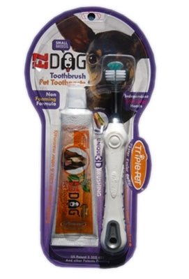 The Triple Pet toothbrush gets the job done faster, easier and better. The three flexible heads maintain the proper pressure on all surfaces of the tooth with every stroke. In addition to the standard top bristles, the two side bristles are at the proper 45 degree angle for thorough surface cleaning while the soft outer bristles massage and stimulate your pet's gums. By running the brush over thinner and thicker parts of a finger, you can see Triple Pet's independent brushes in action!
