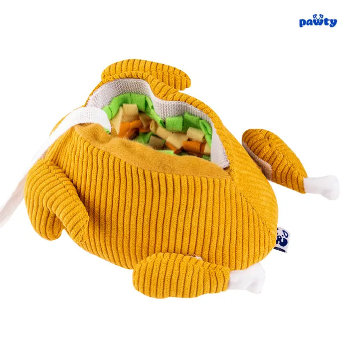 Celebrate every holiday or birthday with the Pawty Toys Turkey! Designed with cute detachable thighs, plushies inside, and a treat slot pull-out feature, this interactive toy is perfect for small to medium dogs looking for a fun chew and mental workout. This turkey is a sure hit for any occasion, made to bring laughs and excitement.
