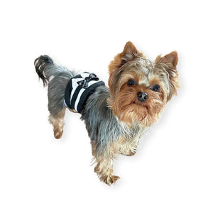 Measure your dog's rear girth (lower tummy) with a tape measure. Add approximately one inch to the measurement to accommodate a disposable incontinent pad. We recommend using a disposable incontinent pad for maximum absorption and hygiene, as the pads are specifically designed to pull moisture away from the dog's tummy, keep the skin dry, and neutralize odor.