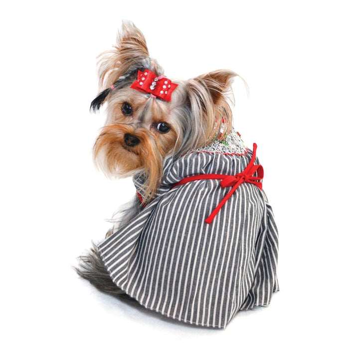 , contrasted by red piping, spaghetti sash, and matching fabric covered button.