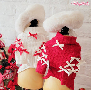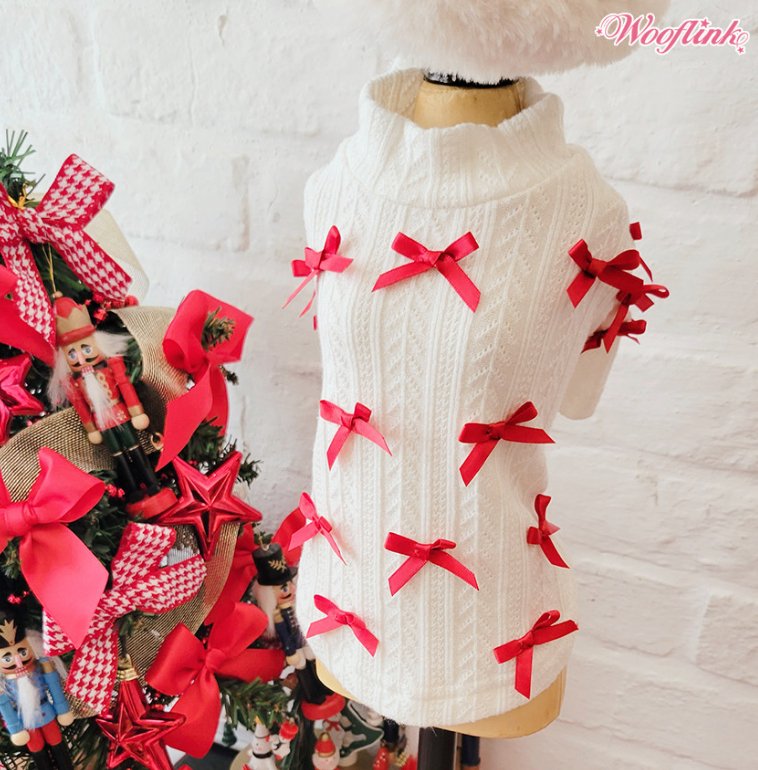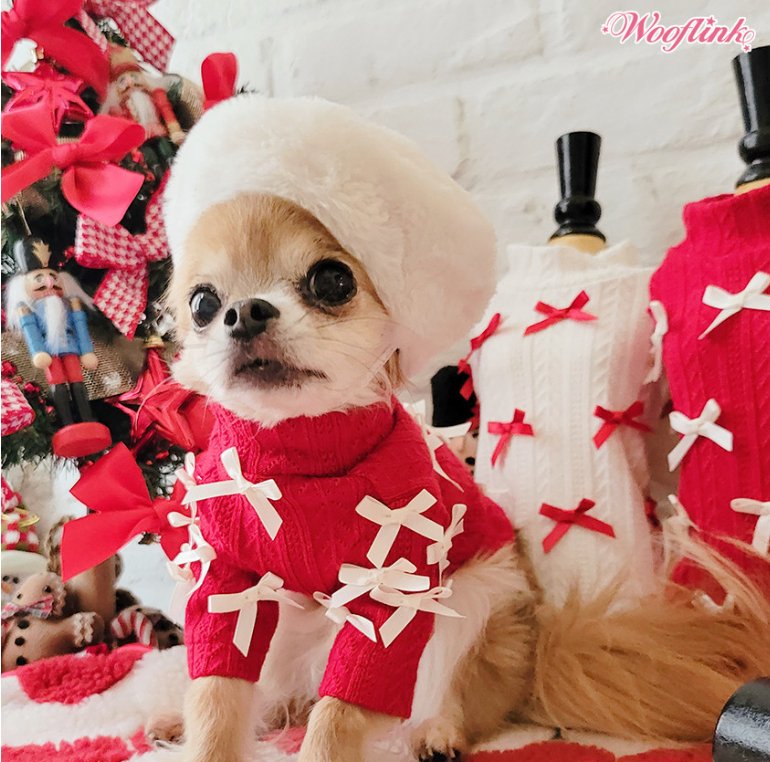 Adorable turtleneck sweater for MinnieMee! The white cable knit with red bows is so cute. Looks great for an everyday look. Would definitely recommend for a stylish pup!