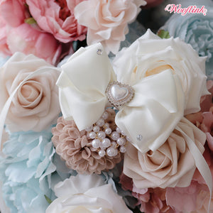 Luxurious satin bow necklace with heart shaped pearl charm & rhinestones