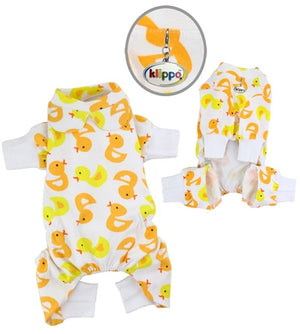 Adorable pajamas made with soft and lightweight knit cotton fabric, with yellow ducky prints all over!
