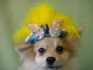 Cute hat for dogs and cats. Made from velvet fabric decorated with a butterfly swarovski crystal and feathers. Hat comes in one size that fit xs, s, m dogs ( tea cup ,small and medium) Hat stays in place with a adjustable elastic to fit all sizes. Your puppy or kitty wood look adorable in this hat . This is prefect accessory for an " elegant" pet.