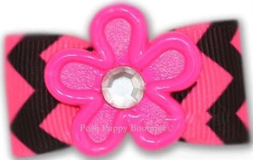 Still trending everyones favorite chevron in black on a bright pink grosgrain ribbon with a pink flower with a center crystal accent. Stiffened for extended wear; approx. 1.75 wide; ribbon is 7/8