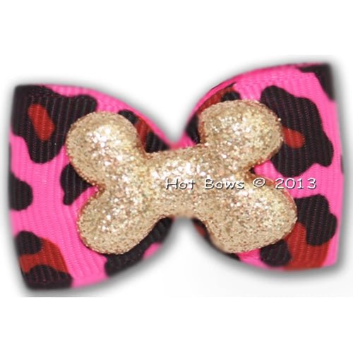 A sparkly gold bone is this center on a pink animal print grosgrain ribbon. Let your inner party animal out! Ribbon 7/8"; this bow is stiffened.